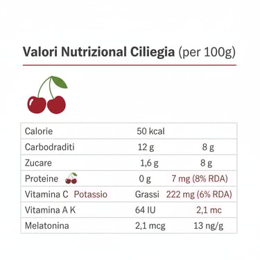 Le ciliegie sono ricchissime di antocianine, i pigmenti responsabili del loro colore rosso intenso. Questi potenti antiossidanti combattono i radicali liberi e proteggono le cellule dall'invecchiamento. Le varietà più scure, come le Ferrovia o le Durone, contengono concentrazioni maggiori di questi preziosi composti.