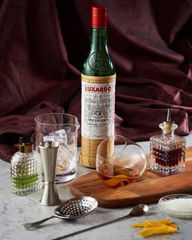 Il Maraschino è un distillato cristallino ottenuto dalle amarene marasche, inclusi noccioli e foglie. Il suo sapore è unico: dolce ma non stucchevole, con note di mandorla amara e una leggera speziatura. È indispensabile in classici come l'Aviation, l'Hemingway Daiquiri e il Last Word.
