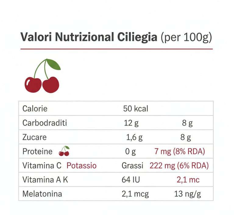 Le ciliegie offrono numerosi vantaggi: supportano la salute cardiovascolare grazie al potassio, favoriscono il recupero muscolare dopo l'attività fisica, possiedono proprietà antinfiammatorie naturali e contribuiscono alla regolazione del ciclo sonno-veglia. Il loro basso indice glicemico le rende inoltre adatte anche a chi monitora l'assunzione di zuccheri.